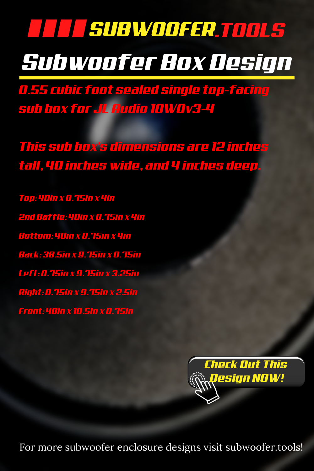 0.55 cubic foot sealed single top-facing sub box for JL Audio 10W0v3-4. This sub box's dimensions are 12 inches tall, 40 inches wide, and 4 inches deep.