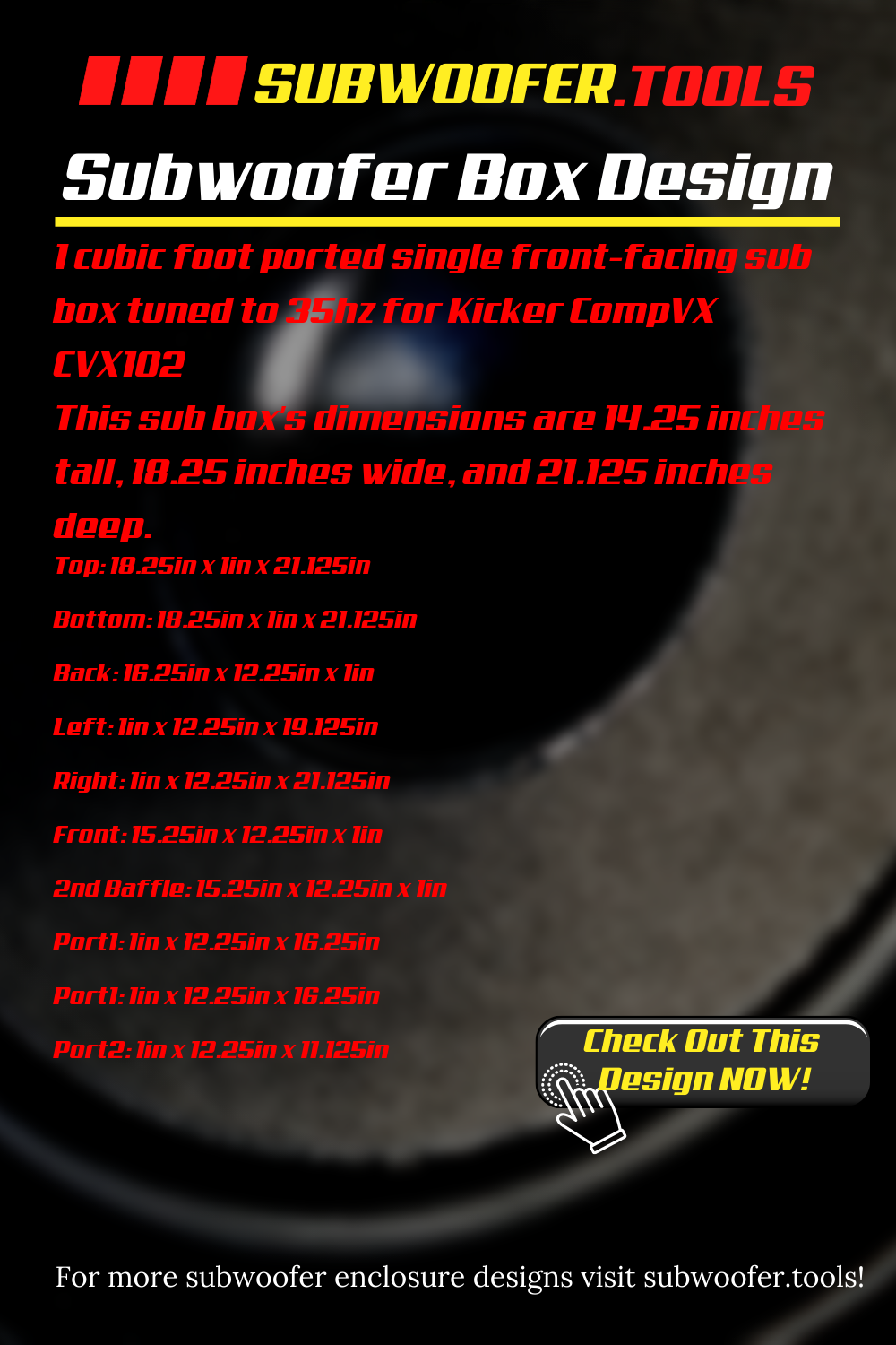 1 cubic foot ported single front-facing sub box tuned to 35hz for Kicker CompVX CVX102. This sub box's dimensions are 14.25 inches tall, 18.25 inches wide, and 21.125 inches deep.