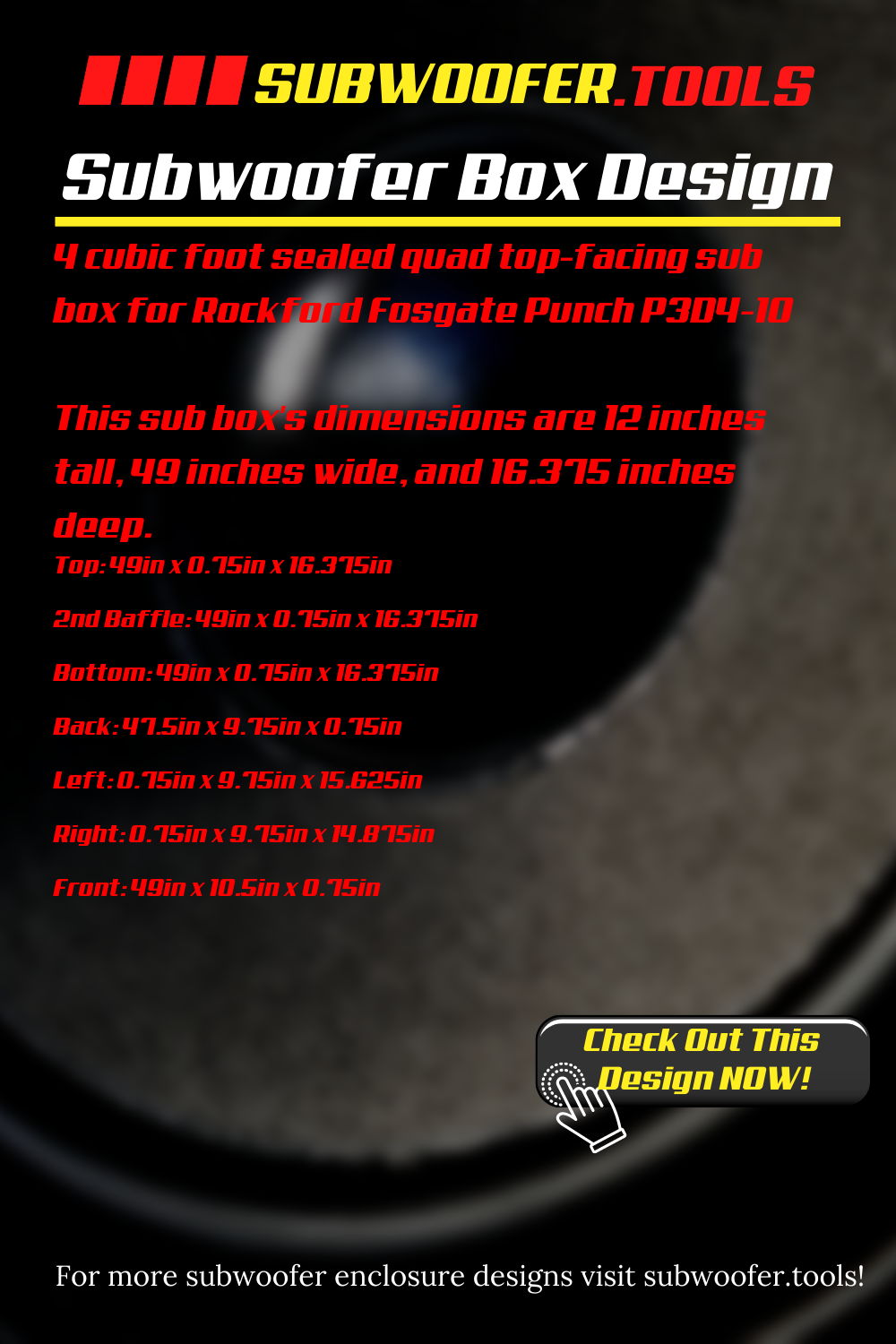 4 cubic foot sealed quad top-facing sub box for Rockford Fosgate Punch P3D4-10. This sub box's dimensions are 12 inches tall, 49 inches wide, and 16.375 inches deep.
