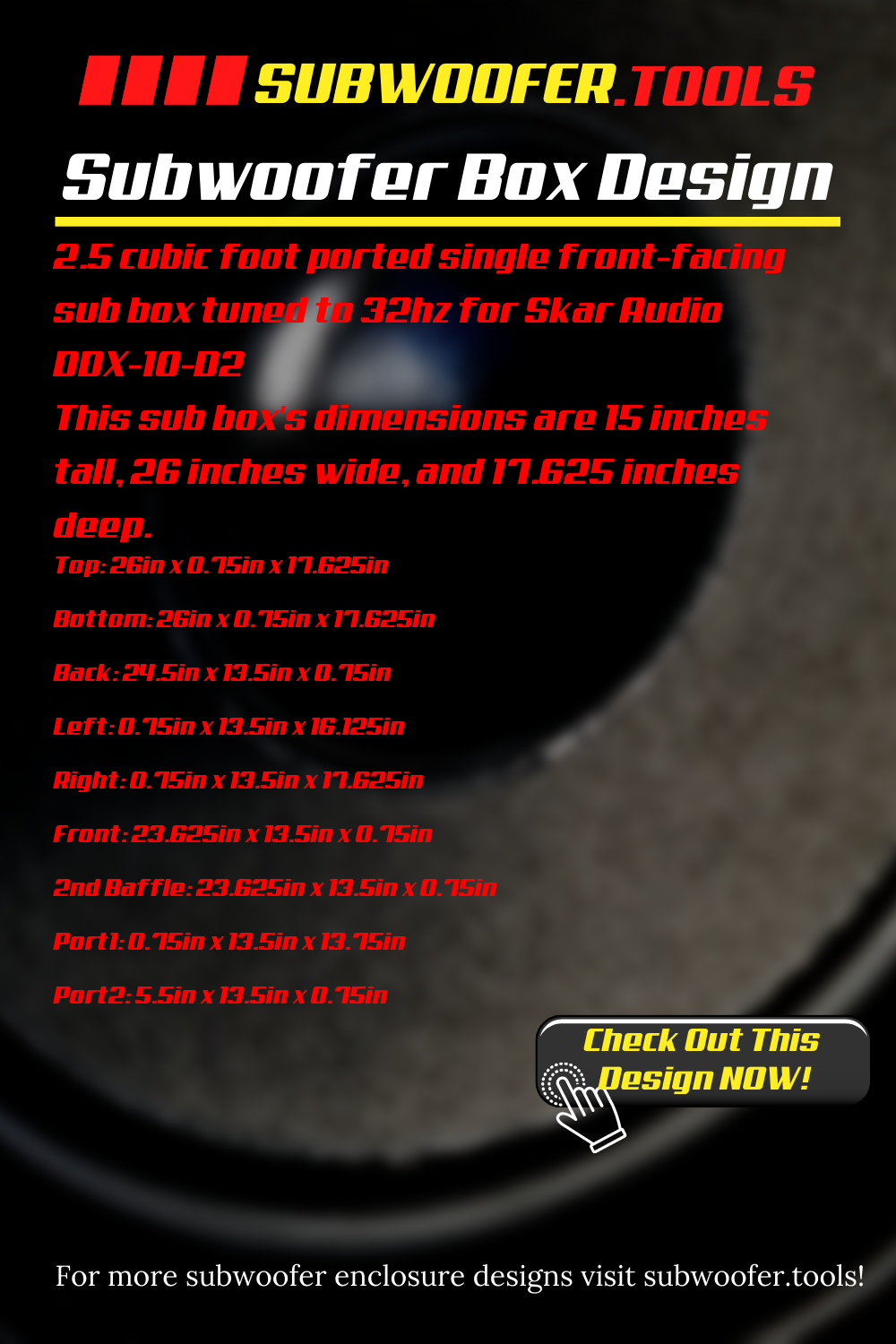 2.5 cubic foot ported single front-facing sub box tuned to 32hz for Skar Audio DDX-10-D2. This sub box's dimensions are 15 inches tall, 26 inches wide, and 17.625 inches deep.