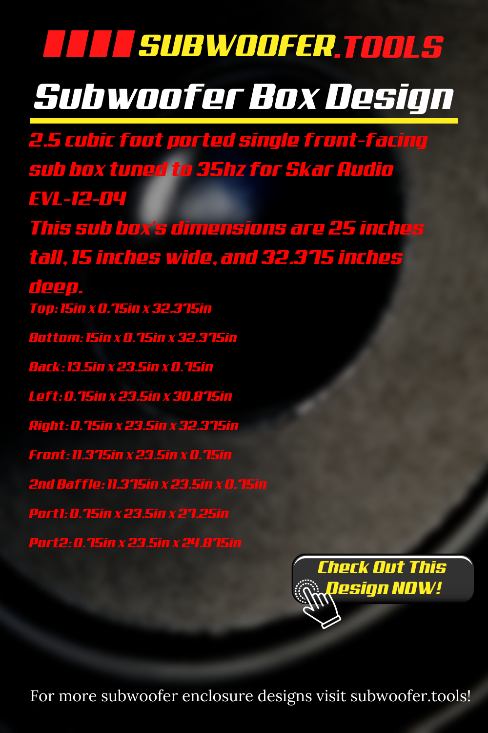 2.5 cubic foot ported single front-facing sub box tuned to 35hz for Skar Audio EVL-12-D4. This sub box's dimensions are 25 inches tall, 15 inches wide, and 32.375 inches deep.
