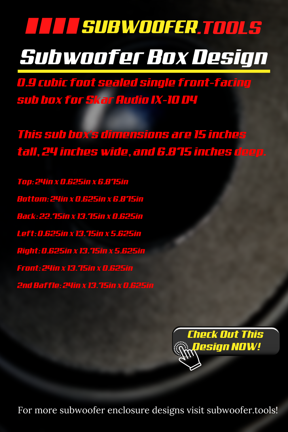 0.9 cubic foot sealed single front-facing sub box for Skar Audio IX-10 D4. This sub box's dimensions are 15 inches tall, 24 inches wide, and 6.875 inches deep.