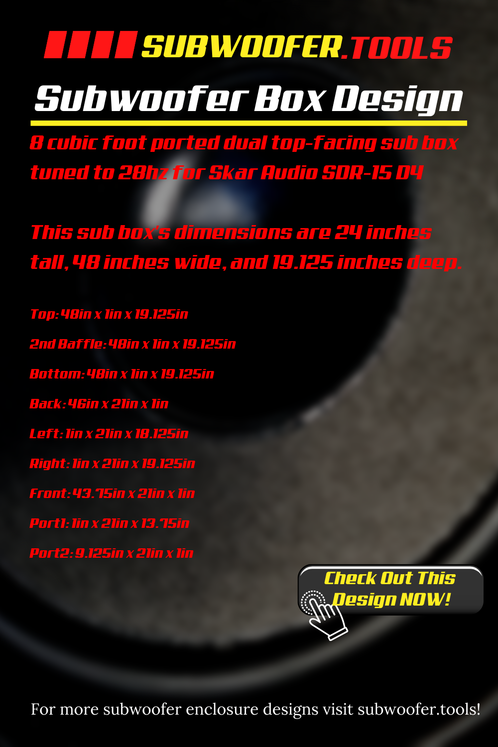 8 cubic foot ported dual top-facing sub box tuned to 28hz for Skar Audio SDR-15 D4. This sub box's dimensions are 24 inches tall, 48 inches wide, and 19.125 inches deep.