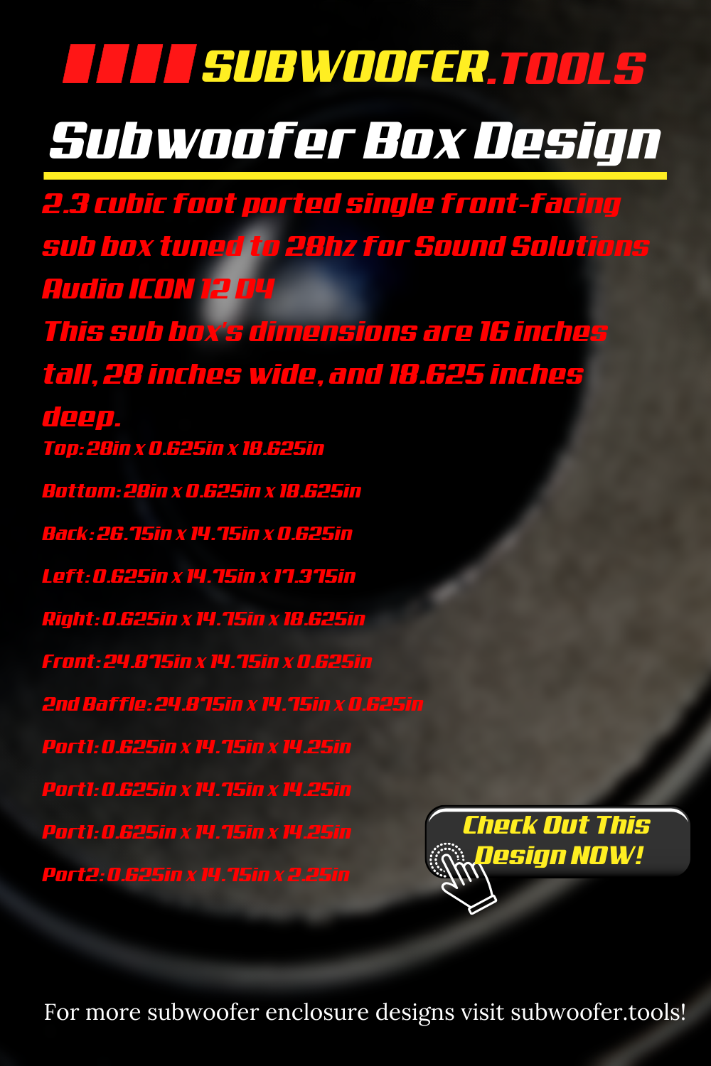 2.3 cubic foot ported single front-facing sub box tuned to 28hz for Sound Solutions Audio ICON 12 D4. This sub box's dimensions are 16 inches tall, 28 inches wide, and 18.625 inches deep.