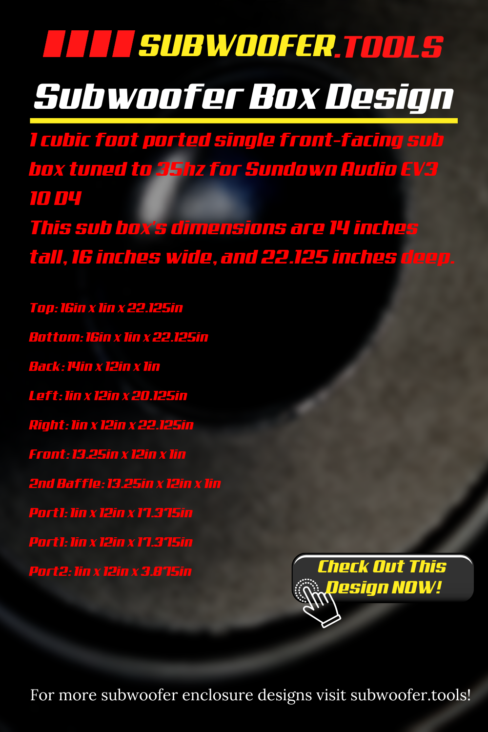 1 cubic foot ported single front-facing sub box tuned to 35hz for Sundown Audio EV3 10 D4. This sub box's dimensions are 14 inches tall, 16 inches wide, and 22.125 inches deep.